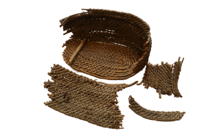 Ручка из металлической ленты сломана, отходит с одной стороны от стенки, оплетка берестяная с ручки ободрана, корзина потеряла форму